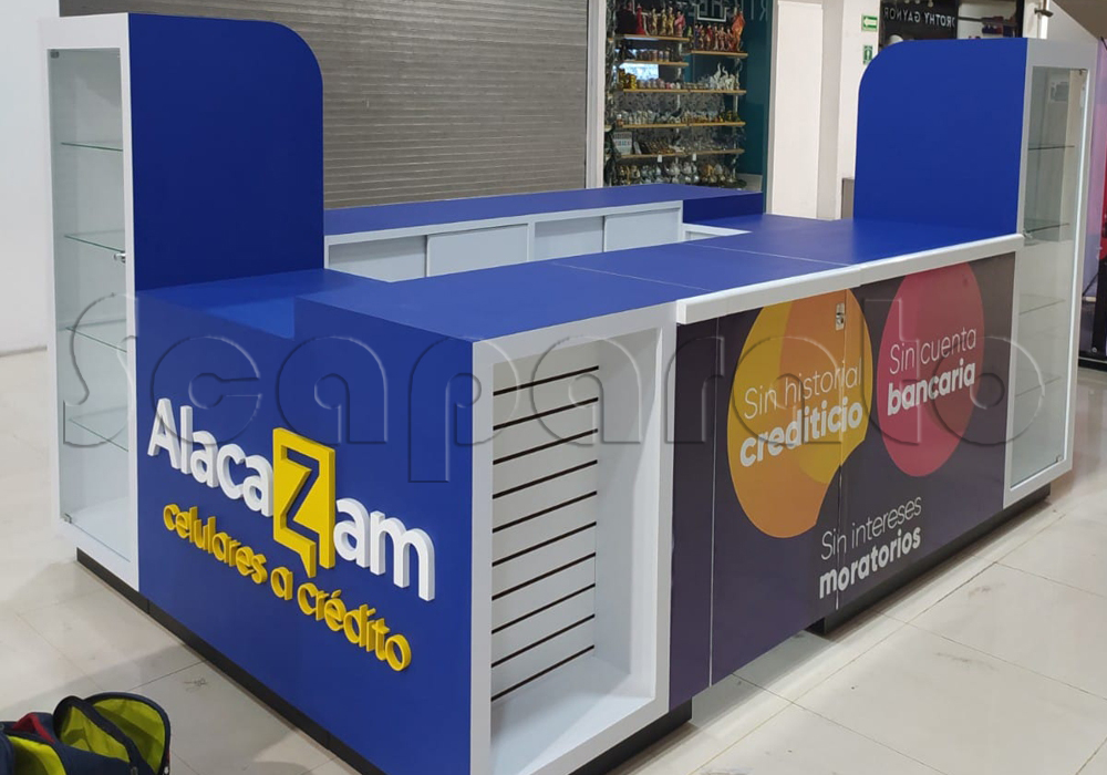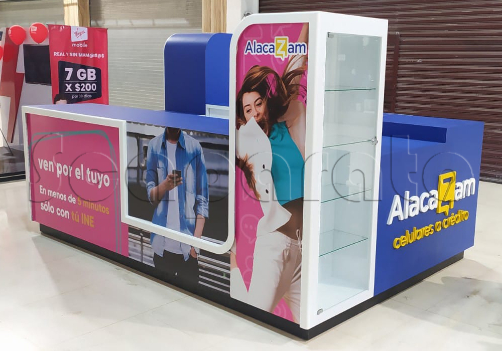 Un módulo de telefonía celular se adapta con facilidad a estos espacios porque combina materiales resistentes, acabados llamativos y estructuras prácticas. La flexibilidad en el diseño permite personalizar colores, formas y tamaños para lograr un estilo único que represente la identidad del negocio.