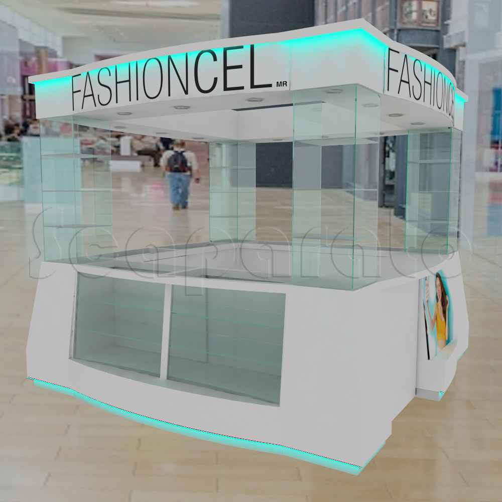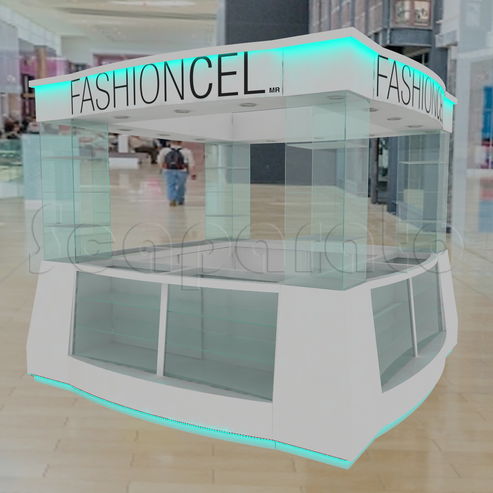 El tamaño y la forma de la isla pueden ajustarse a espacios grandes o pequeños. Los estantes pueden ser horizontales o inclinados, facilitando la visibilidad de cada funda. Incluso es posible incluir iluminación incorporada para resaltar los productos y atraer la atención de los clientes desde cualquier ángulo.